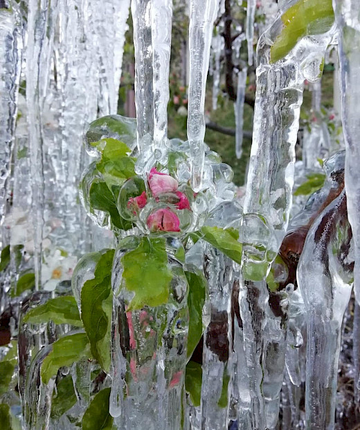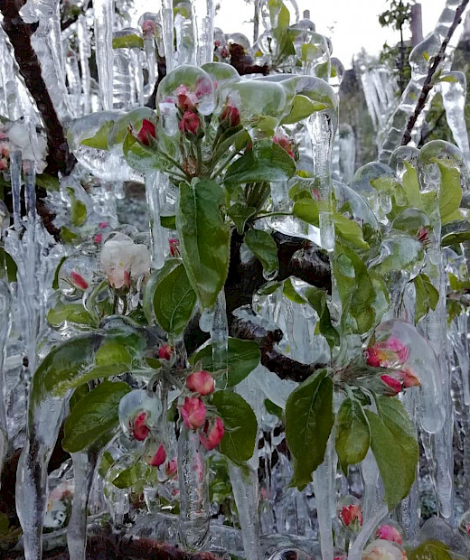 Per proteggere i fiori di melo dal freddo della notte, cospargiamo le nostre piante. L'acqua e il ghiaccio mantengono la temperatura costante a zero gradi e proteggono il fiore dal congelamento. Le formazioni di ghiaccio possono poi essere ammirate la mattina seguente.