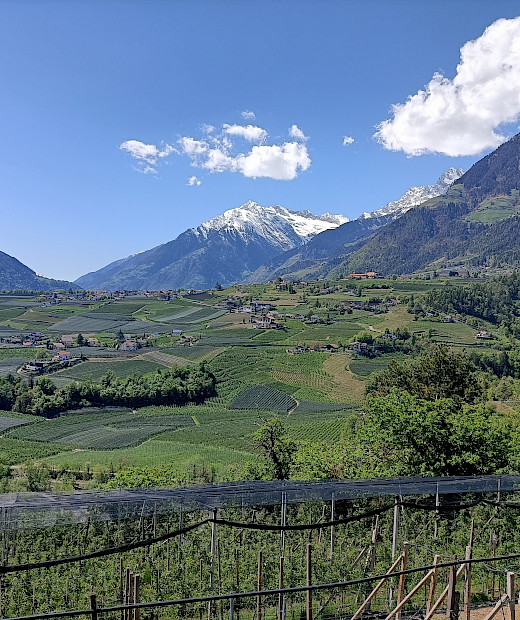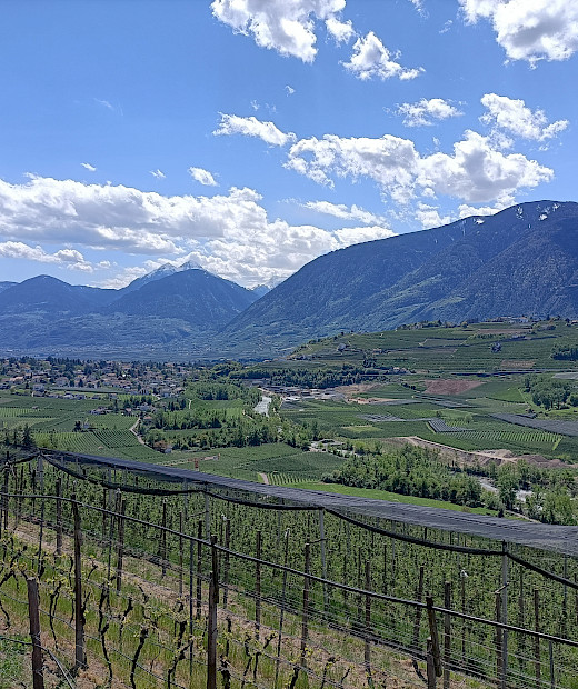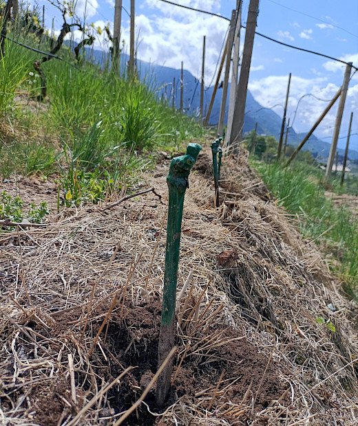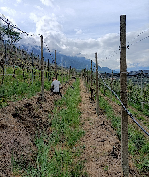 Siamo impegnati e impostiamo le nostre viti, Pinot Bianco e Sauvignon in un tempo da sogno. Siamo già impazienti di assaggiare la frutta e un buon bicchiere di vino bianco.