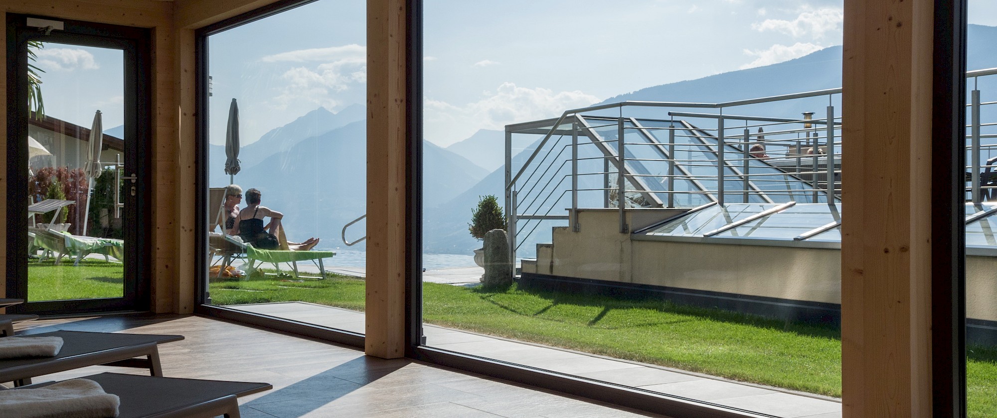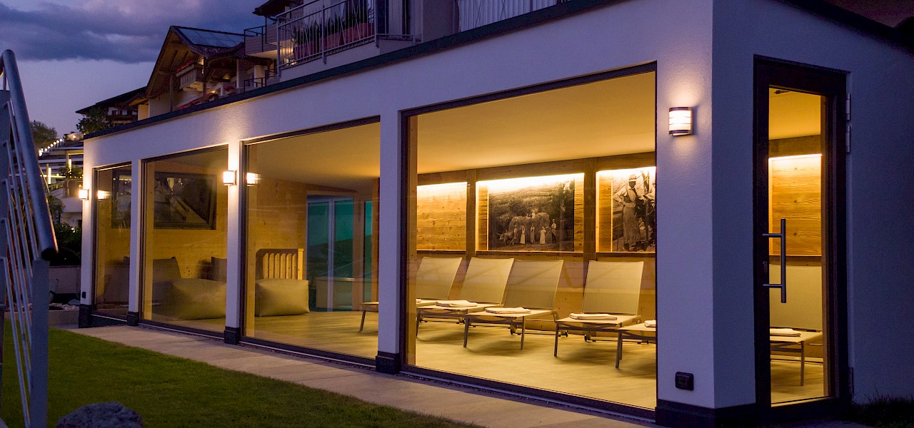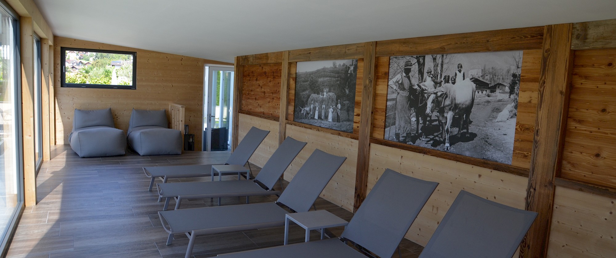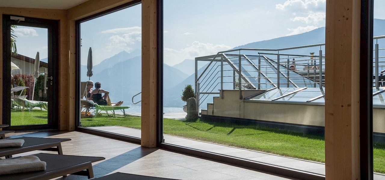Chi non vorrebbe farlo dopo un'escursione, una passeggiata, una sessione di sauna o un tuffo in acqua: rilassarsi e leggere un libro appassionante o un giornale senza fretta? Chiudere gli occhi e godersi la pace e la tranquillità, o sedersi comodamente su una sedia a sdraio e ammirare il magnifico paesaggio panoramico? Potete scoprire tutto questo da soli nella nostra sala relax con vista.
